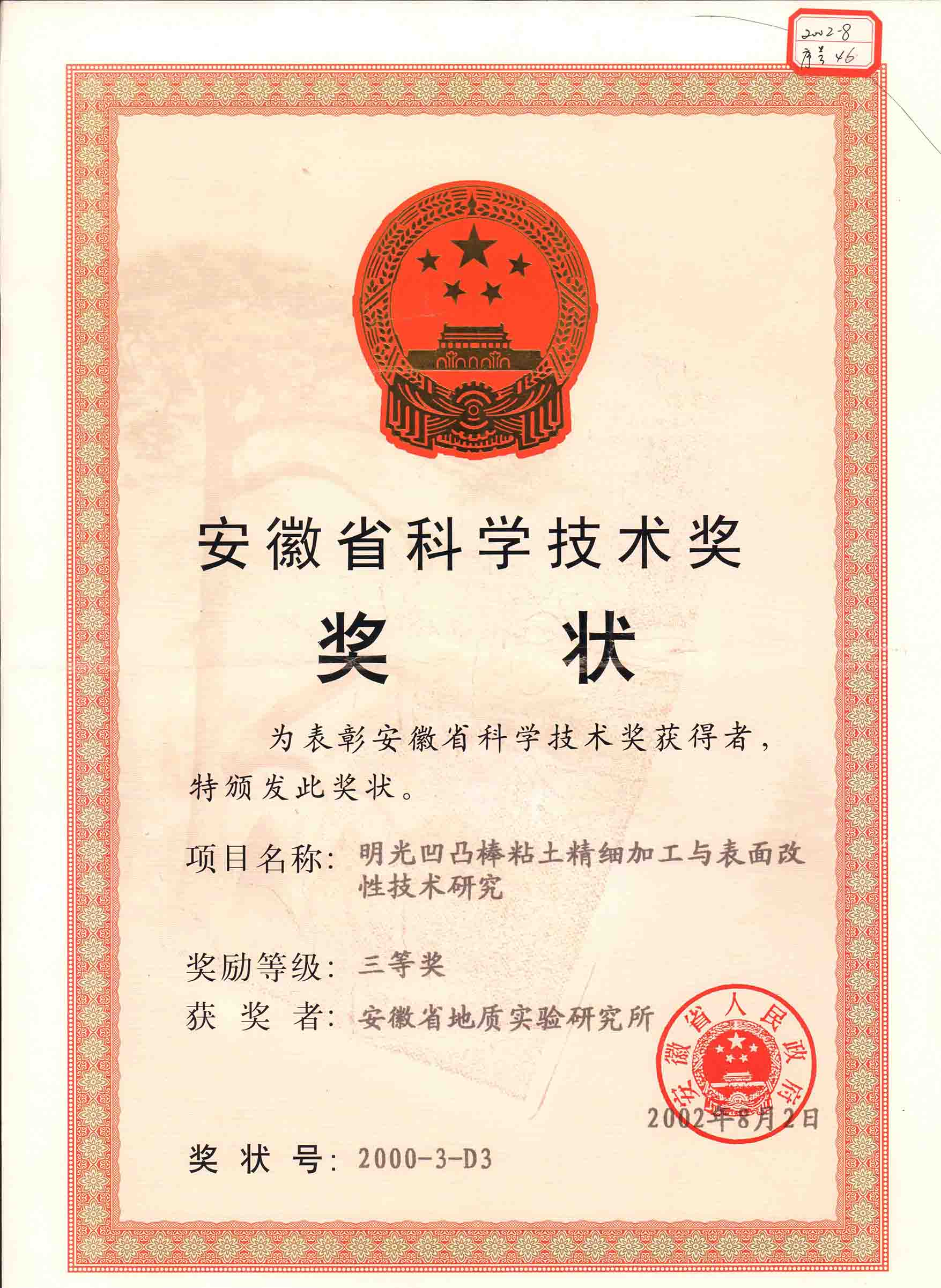 安徽省科学技术奖(三等奖) 明光凹凸棒粘土精细加...