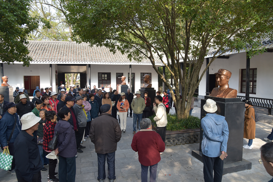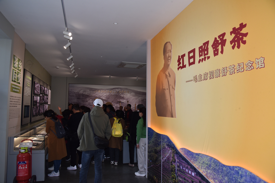 金汤湖碧波荡漾,两岸青山层林尽染。大家在秋日的暖阳中漫步,或拍照打卡,或畅聊叙旧。随后,大家来到舒茶人民公社景区参观游览。1958年9月16日,毛主席亲临舒茶人民公社视察,发出“以后山坡上要多多开辟茶园”的伟大号召,舒茶的名字从此响彻全国。老同志们在毛主席视察舒茶纪念馆中仔细聆听讲解,观看一件件文物,思绪被引入那似火年代的红色记忆中。大家拾级而上,游览九一六茶园。在尽情领略自然风光与乡村风情的同时,老同志们或三五成群畅谈生活的点滴与活动的见闻,或与昔日的工作伙伴留下秋日靓影,欢声笑语此起彼伏,现场气氛温馨而热烈。